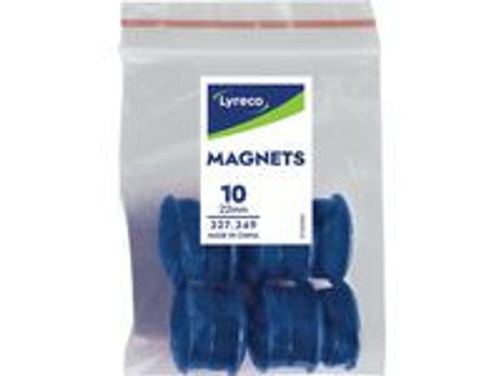 Beskrivning av Magnetknappar LYRECO 22mm röd/blå 10/fp Magneter med en diameter på 22 mm och en bärförmåga på 6 ark. - Magneter med en diameter på 22 mm - - Bärförmåga på 6 ark,