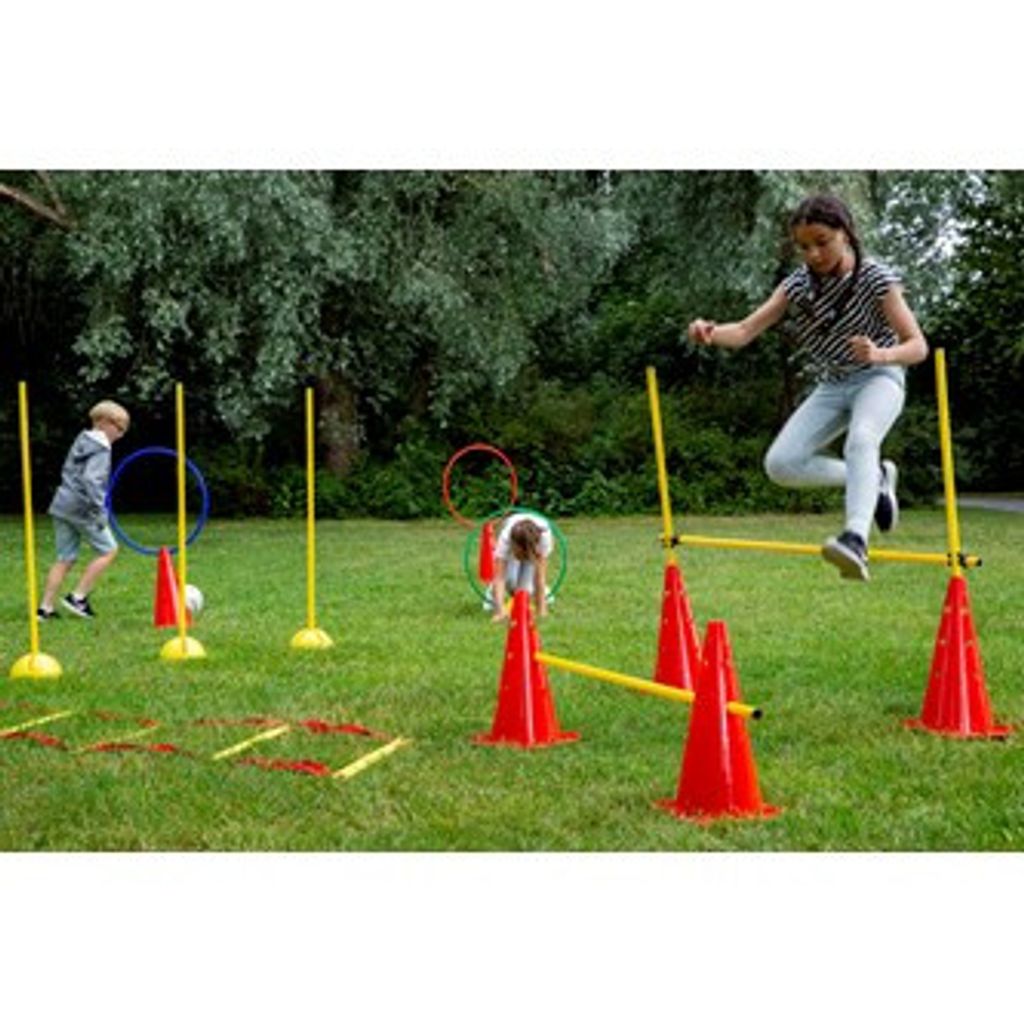 Beskrivning av Motorikbana stor 32 delar. Stor motorikbana som ger många möjligheter till en mer aktiv skoldag och rast. Innehåller: 6 koner med hål, 8 fästen till stav, 8 stavar till kon, 5 lekringar, 4 allroundkoner och 1 löpstege.