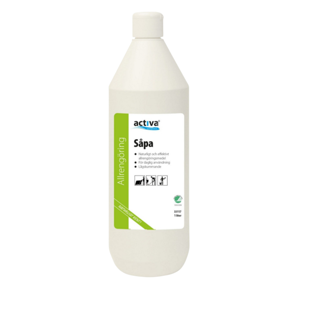 Activa Såpa• Naturligt och effektivt allrengöringsmedel• För all daglig användning• LågskummandeActiva Såpa är tillverkad av naturliga fettsyror. Produkten lämpar sig för daglig rengöring och underhåll av sten-, trä- och plastgolv. Activa Såpa kan användas för rengöring av kakel, sanitetsgods och även till ugnsrengöring.Bruksanvisning: Dosera enligt nedan och använd produkten i maskin eller manuellt efter behov. Vid ugnsrengöring, stryk ut såpan på ugnens insidor.Värm till 100°C eller till såpan börjar bubbla, stäng då av ugnen och låt kallna.Torka med duk och skölj noga med vatten. Torka torrt.Dosering:Lätt rengöring: 5 ml till 10 lit vattenNormal rengöring: 10-20 ml till 10 lit vattenKraftig rengöring: 50-70 ml till 10 lit vattenUgnsrengöring: Koncentrat.pH-värde: Koncentrat 10,6.Innehåll: Såpa (förtvålad tallolja), anjoniska tensider <5%Förpackning: Förvara produkten i originalförpackning. Förvaras frostfritt.Använda och förbrukade emballage ska lämnas till kommunens återvinningscentraler. Sorteras som hårda plastförpackningar.