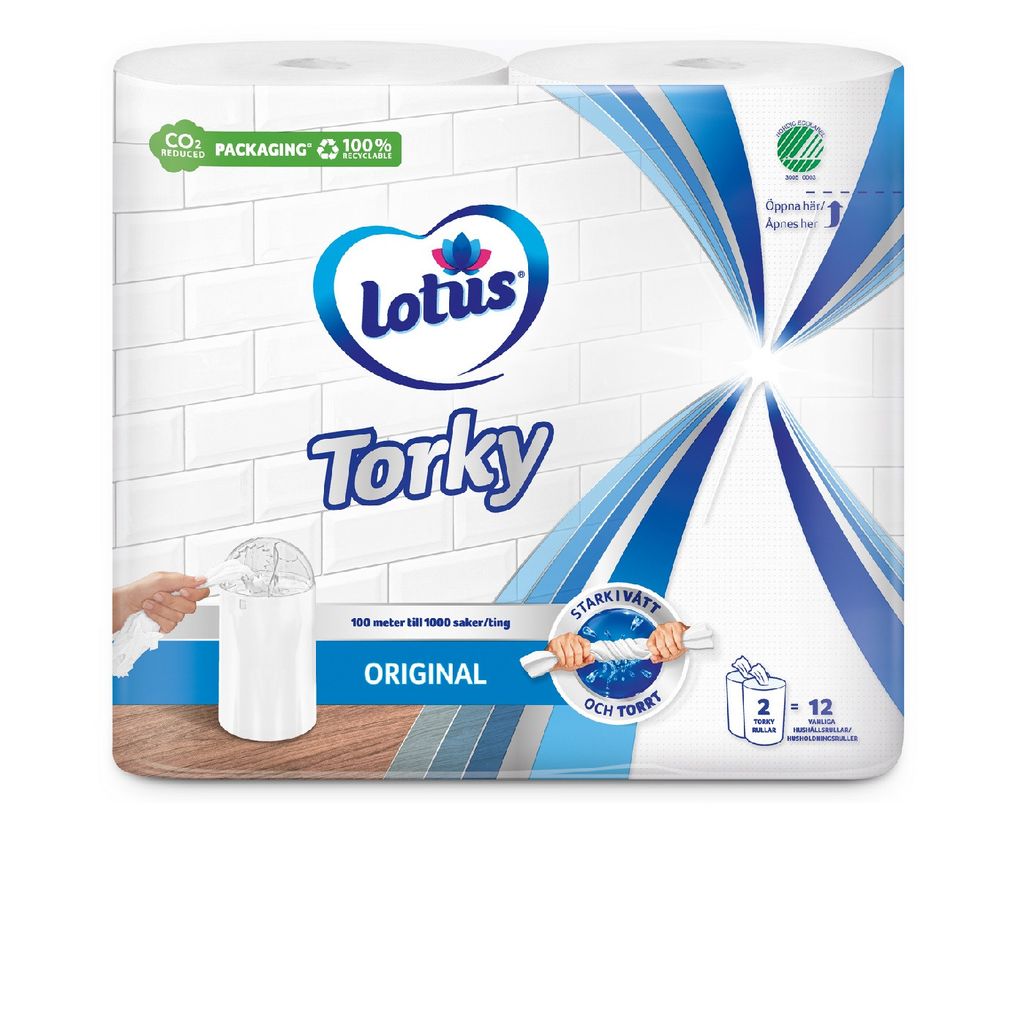 LotusTorky är ett mycket våtstarkt och luddfritt papper som klarar det mesta. En rulle Lotus Torky innehåller hela 100m, vilket är ca sex gånger så långt som en vanlig hushållsrulle. Lotus Torkys slagord är 100meter till 1000 saker och det är precis vad du får - ett centrum matat hushållspapper som tar hand om alla möjliga och omöjliga situationer. 100 meter/rulle. 6x2 rullar/förp. 125120 heter hållaren som finns att köpa till. 2 rl/fp