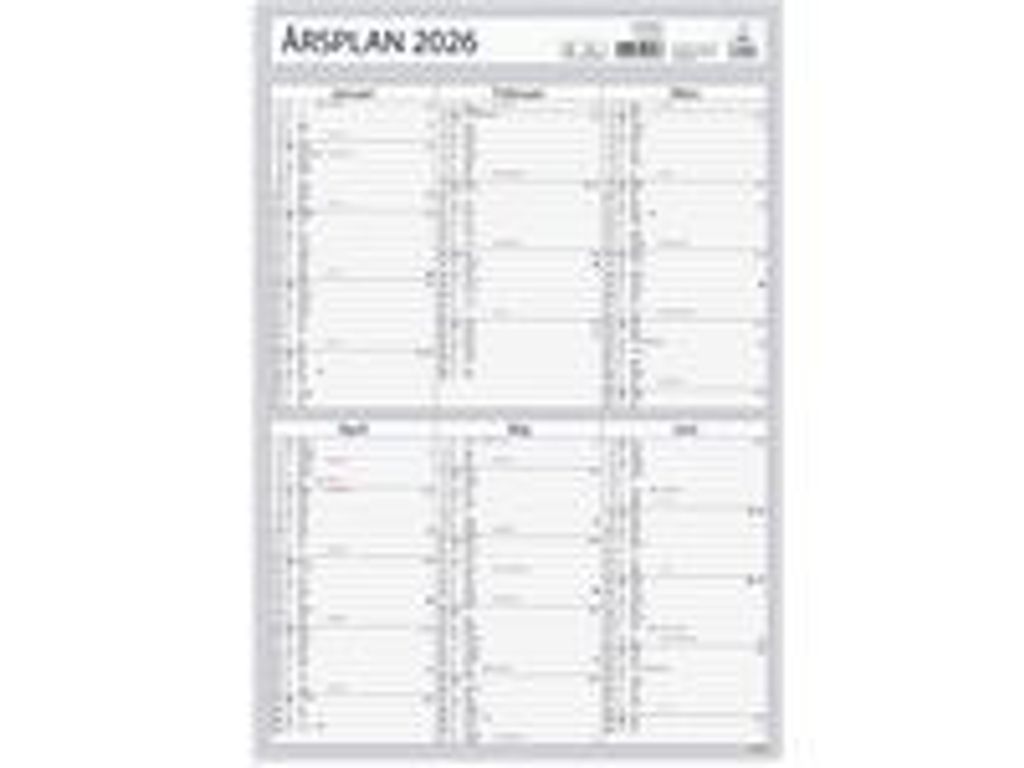 Format: 230x330 mm. Layout: Halvår/sida. Kalendarium: 2026-01-01 - 2026-12-31. Innehåll: Kyrkliga helgdagar, Flaggdagar, Helgdagar, Månfaser, Namnsdagar, Anteckningssidor, Årsplan/årsplaner. Antal sidor: 2. Miljöinformation: FSC®. Ecolabel. - Format: 230x330 mm - Layout: Halvår/sida - Kalendarium: 2026-01-01 - 2026-12-31 - Innehåll: Kyrkliga helgdagar, Flaggdagar, Helgdagar, Månfaser, Namnsdagar, Anteckningssidor, Årsplan/årsplaner - Antal sidor: 2