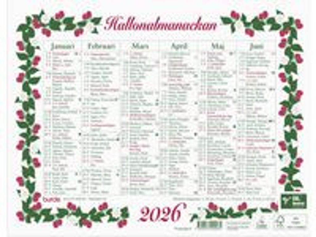 Beskrivning av Väggkalender Lilla Hallonalmanackan 2026 Ett halvår per sida. Med namnsdagar. - Format: 245x190 mm - Layout: Halvår/sida - Kalendarium: 2026-01-01 - 2026-12-31 - Innehåll: Kyrkliga helgdagar, Flaggdagar, Helgdagar, Månfaser, Namnsdagar - Antal sidor: 2